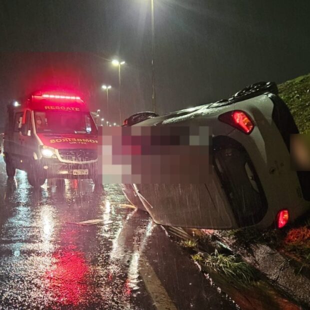 Os bombeiros encontraram um Renault Kwid branco tombado na lateral da estrada. Apesar de parecer um acidente grave, o motorista já havia saído do veículo quando a equipe chegou. Ele foi avaliado seguindo os protocolos de trauma usados em acidentes, mas mesmo assim decidiu não ir para o hospital.