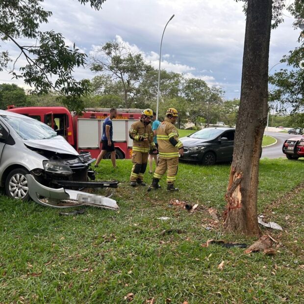 No local, os socorristas encontraram um carro modelo VW Fox, prata, que havia batido contra uma árvore na área verde. Imediatamente, as equipes iniciaram o atendimento às vítimas, seguindo os protocolos para casos de trauma.