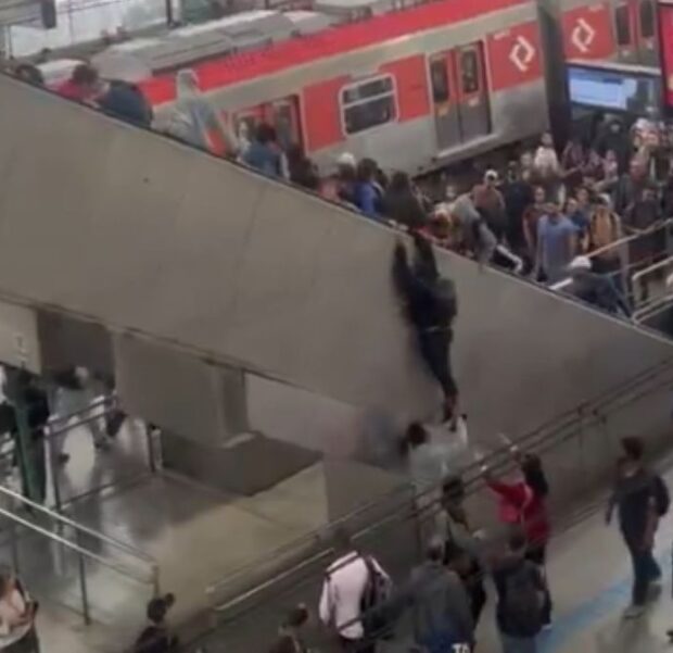 Vídeos nas redes sociais mostram a confusão e as pessoas se chocando na escada rolante, que fica na estação Brás, ponto de acesso à Linha 10 Turquesa da CPTM, sentido Rio Grande da Serra.