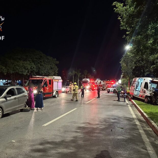 Segundo o Corpo de Bombeiros Militar do Distrito Federal (CBMDF), foram enviadas três viaturas para o atendimento. No local, encontraram o carro com o motorista ileso, e a ambulância que, após a colisão, saiu da estrada e bateu em um poste.