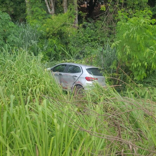 Os bombeiros encontraram um Fiat Argo prata fora da pista, após a colisão com um caminhão vermelho da marca Mercedes-Benz. O impacto danificou o carro e deixou o condutor ferido.