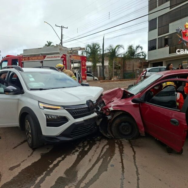 No local, os bombeiros encontraram dois veículos envolvidos: um Chevrolet Celta vermelho e um Renault Kardian branco. Eles logo fizeram o atendimento inicial e verificaram o estado dos motoristas.