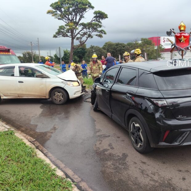 No local, os bombeiros encontraram uma colisão entre dois carros: um BYD Dolphin preto e um GM Onix branco. A área foi isolada e a via foi bloqueada para garantir a segurança durante o atendimento.
