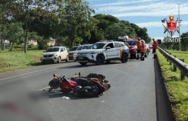O Corpo de Bombeiros Militar do Distrito Federal atendeu a ocorrência às 7h49, enviando três equipes de resgate para o local próximo ao Home Center Rezende. A colisão envolveu uma motocicleta Yamaha vermelha e um VW T-Cross branco.