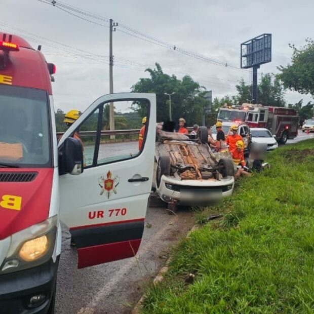 Os bombeiros também estabilizaram o carro que estava capotado e tomaram medidas para evitar fogo e outros acidentes.