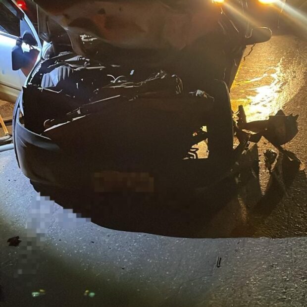 Ao chegarem, os bombeiros encontraram um Chevrolet Montana Conquest prata que tinha batido na traseira de um caminhão Mercedes-Benz azul. Eles isolaram a área, sinalizaram a via e tomaram medidas para garantir a segurança antes de entrar no carro.