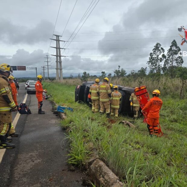 O acidente aconteceu próximo ao km 8 da rodovia, perto do Condomínio Bougainville, na região conhecida como Rota do Cavalo. Ao chegarem ao local, os bombeiros encontraram um carro preto tombado de lado fora da pista, precisando isolar a área e controlar os riscos imediato.