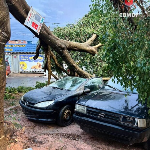 O CBMDF recomenda que motoristas evitem estacionar seus veículos embaixo de árvores durante períodos de chuva forte e ventos intensos para evitar acidentes.