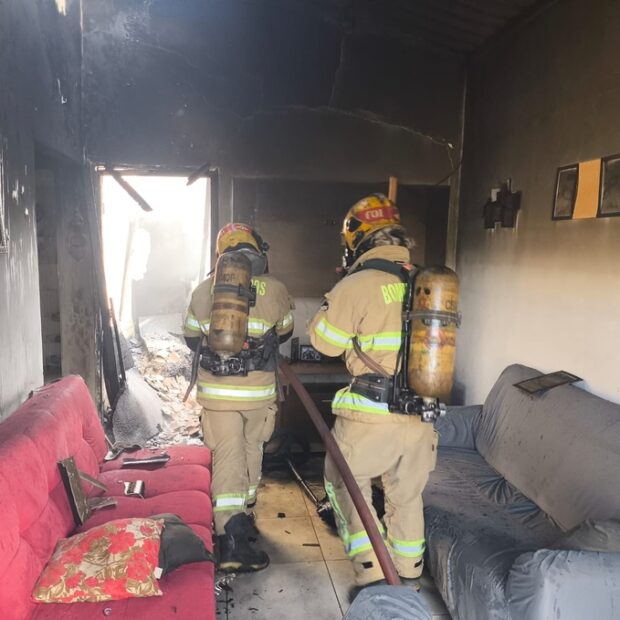 Ao chegar, os bombeiros encontraram um incêndio em uma residência de alvenaria com cerca de 50 m². O fogo estava concentrado em um dos quartos, atingindo uma área de aproximadamente 10 m². Antes da chegada dos profissionais, moradores da vizinhança tentaram conter as chamas com baldes de água e usando reservatório de piscina plástica, limitando a propagação do fogo.