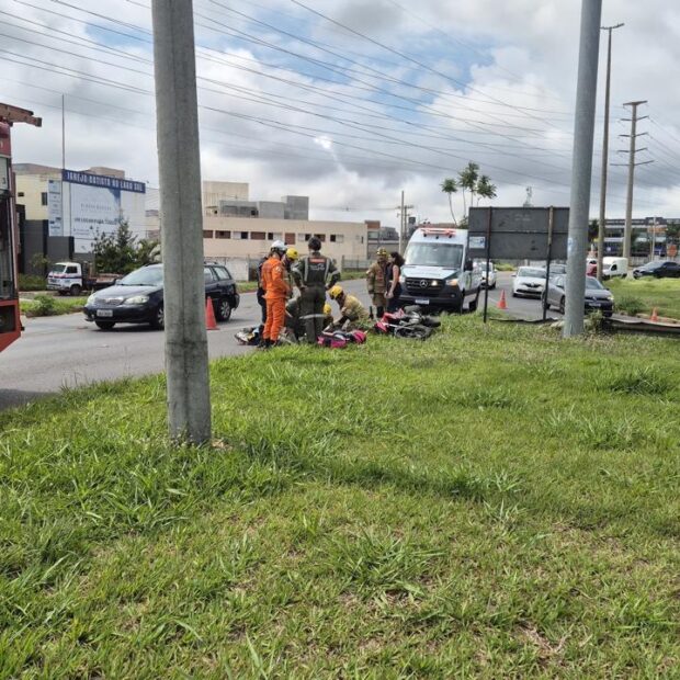 A batida envolveu um carro preto BYD Song Pro e uma motocicleta vermelha Honda CG, na frente do Condomínio Solar de Brasília. O motociclista e a passageira ficaram feridos e receberam atendimento imediato dos bombeiros no local, sendo depois levados ao hospital para exames e cuidados.