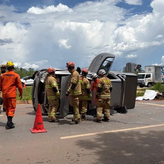 Ao chegarem no local, os bombeiros encontraram uma caminhonete prata tombada na via. O motorista estava preso dentro do veículo, enquanto a passageira já havia saído do automóvel.