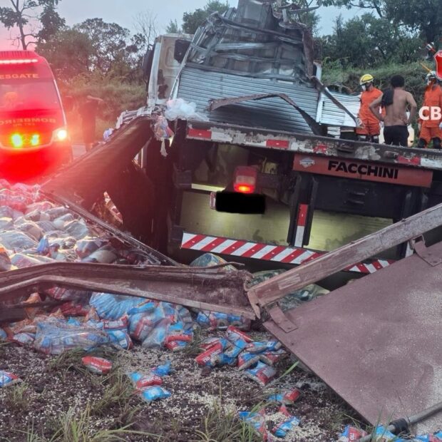 No local do acidente, os bombeiros encontraram um caminhão tombado, com carga de arroz espalhada pela rodovia. As equipes isolaram a área, sinalizaram para os motoristas e tomaram medidas para evitar novos riscos.