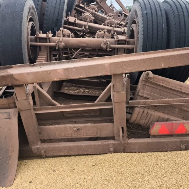 Quando chegaram ao local, os bombeiros encontraram a carreta caída fora da pista, com parte da soja espalhada pela vegetação próxima. Apesar do ocorrido, o trânsito no local seguiu normalmente.