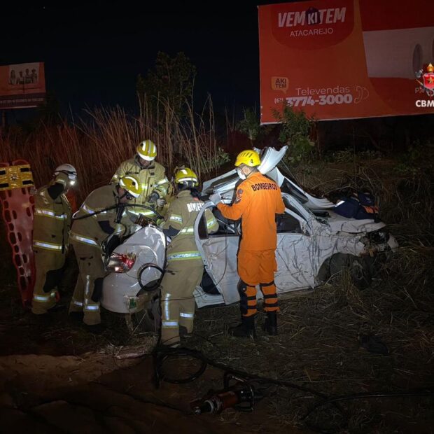 Na noite de quarta-feira (8), um carro capotou na BR-040, próximo ao viaduto que leva a Valparaíso de Goiás, mobilizando as equipes do Corpo de Bombeiros Militar do Distrito Federal (CBMDF). O chamado foi feito às 20h28, e três viaturas de resgate foram enviadas ao local.