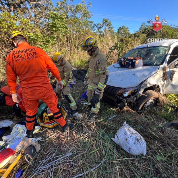 O Corpo de Bombeiros do Distrito Federal foi chamado às 07h08 e enviou três viaturas para o socorro. Eles encontraram uma caminhonete Mitsubishi L200 Triton, branca, caída na ribanceira.