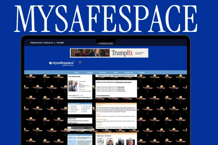 O site, chamado “MySafeSpace — a place for dems”, imita o antigo visual da rede social MySpace, incluindo música de mariachi e referências a figuras democratas.