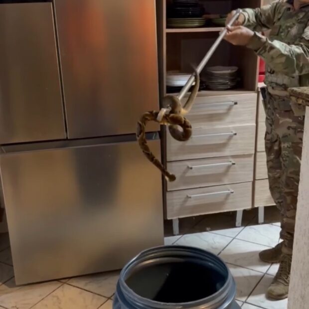 Quando chegaram, os policiais identificaram que a cobra era uma jararaca adulta, uma espécie venenosa considerada perigosa. A serpente estava sobre a bancada da cozinha, um local onde as pessoas circulam com frequência, aumentando o risco de um acidente.