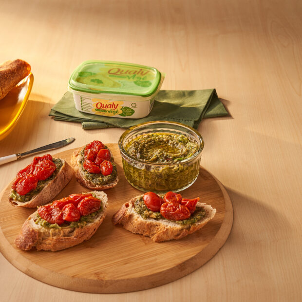 - Montagem: Passe margarina nas fatias de pão e leve ao forno por 5 minutos para tostar. Retire, espalhe o pesto e finalize com os tomates assados. Sirva na hora.