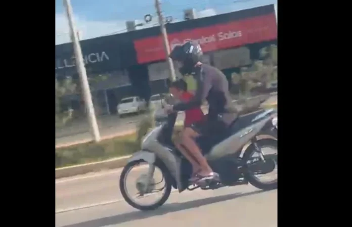 As imagens capturadas por um motorista que trafegava pela via mostram a criança sentada na frente da moto, totalmente sem proteção, enquanto o condutor, que usava capacete, continuava acelerando em um trecho onde a velocidade máxima permitida é 80 km/h.