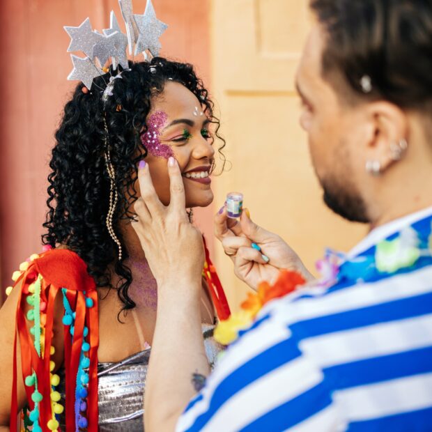 Evite usar produtos com glitter que não foram testados para a pele, pois podem causar irritação ou até inflamar os olhos. Prefira maquiagem segura e não passe perto dos olhos. Também é importante usar boné ou chapéu com aba larga, óculos de sol com proteção UV, roupas claras e leves feitas de tecidos que deixam o ar passar, e sempre ter uma garrafinha de água. Procure não ficar no sol forte entre 10h e 16h, quando o sol queima mais.