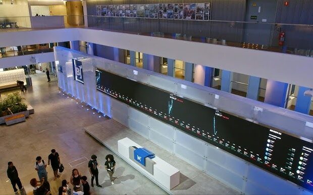 Às 12h08, o dólar caiu 0,7%, sendo cotado a R$ 5,424, acompanhando o movimento global, enquanto a bolsa de valores subiu 0,22%, alcançando 142.918 pontos.