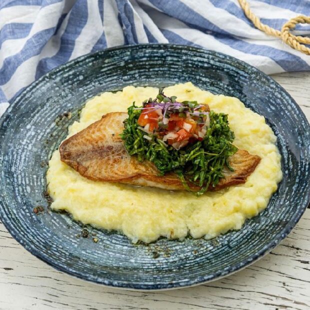 - Tilápia di Provencci – Filé de tilápia grelhado com purê de batata, couve refogada e vinagrete.