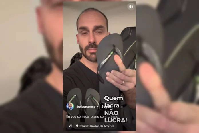 Eduardo Bolsonaro, ex-deputado federal, postou em seu Instagram um vídeo com duras críticas à marca de sandálias Havaianas, chegando a lançar um par fora do lixo. Atualmente nos Estados Unidos, Eduardo teve seu mandato revogado pela Câmara dos Deputados por faltas.