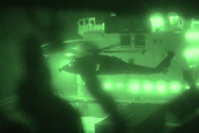 De acordo com o Centcom, fuzileiros navais dos EUA embarcaram a partir do USS Tripoli (LHA 7) em helicópteros no domingo, 19 de abril, para abordar o navio iraniano M/V Touska. No vídeo, é possível ver os soldados descendo de rapel para interceptar a embarcação.