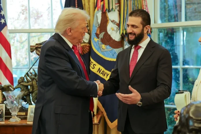 Imagens oficiais divulgadas por Damasco mostraram os dois dirigentes apertando as mãos no Salão Oval, acompanhados por autoridades americanas de alto escalão, como o vice-presidente JD Vance e o secretário de Defesa Pete Hegseth.