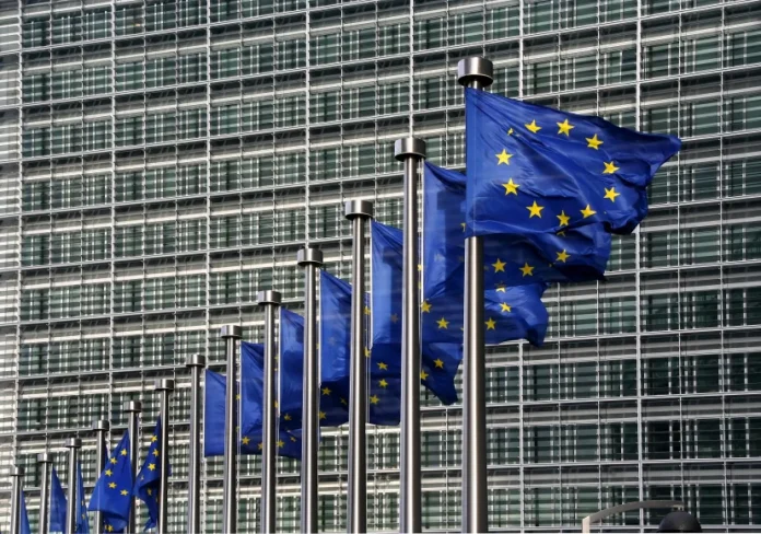 Imagem colorida de bandeiras azuis com estrelas amarelas da União Europeia, tremulando ao lado de um prédio ao fundo – Metrópoles – Foto: iStock