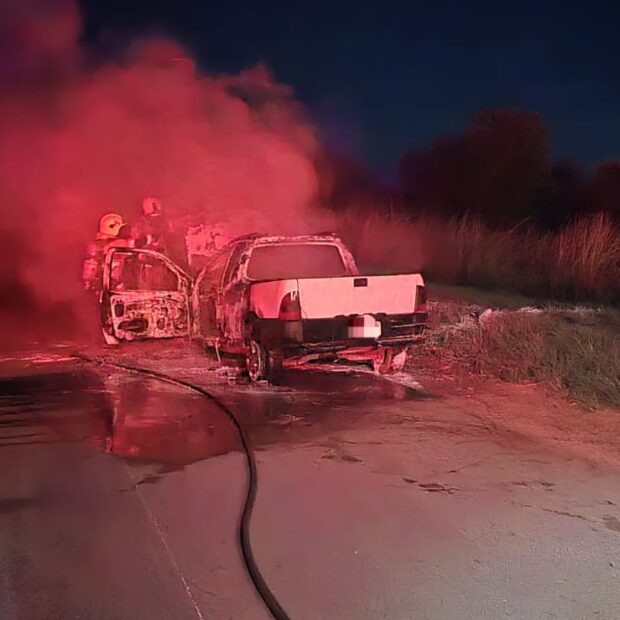 Os bombeiros chegaram por volta das 4h17 e encontraram um Fiat Strada branco em chamas, parado no acostamento. Rapidamente, usaram mangueiras com espuma para controlar o fogo.
