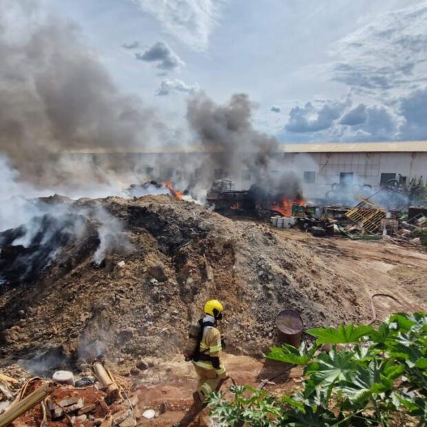 Ao chegar ao local, os bombeiros se depararam com três focos de incêndio dentro da área, o que exigiu uma ação simultânea e bem coordenada das equipes. A principal preocupação foi impedir que o fogo alcançasse uma construção próxima, caminhões estacionados e dezenas de pneus guardados no depósito.