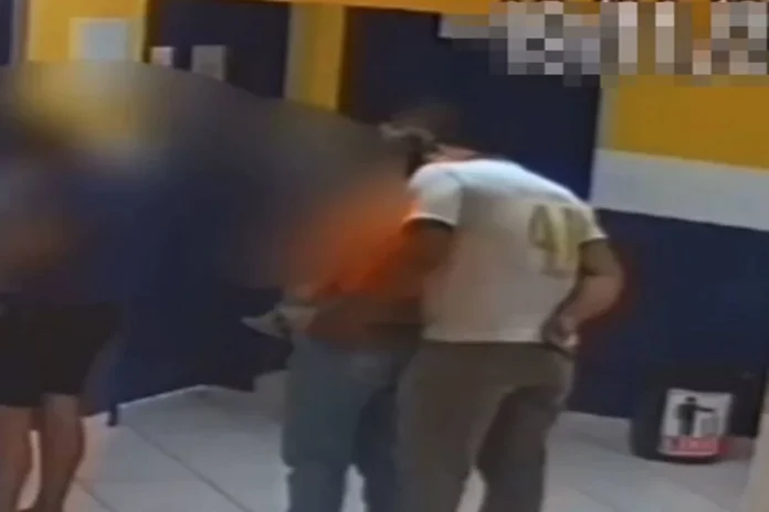 As imagens das câmeras de segurança exibem a vítima na fila quando o agressor se aproxima por trás, a segura e passa a língua em seu pescoço.