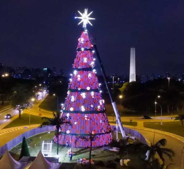 Com 57 metros de altura, a maior árvore de Natal de São Paulo contava com mais de 330 mil luzes LED e flashes nas cores verde e amarela, que são as cores da patrocinadora.