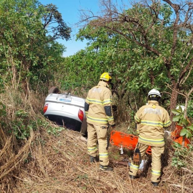 O acidente aconteceu na NR Santos Dumont, Chácara 113. No local, os bombeiros viram um GM Celta prata capotado dentro de uma área de mata, fora da estrada de terra. A motorista, uma idosa, já estava fora do carro quando os socorristas chegaram.
