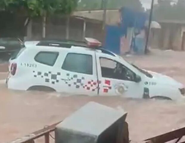 Na mesma rua onde o idoso foi levado pela enxurrada, um carro da Polícia Militar também foi arrastado pela força da água. Dois policiais conseguiram sair do veículo sem se ferirem.