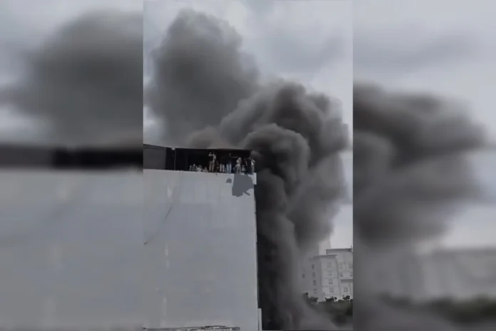 Nas imagens compartilhadas nas redes sociais, muitas pessoas aparecem no topo do prédio enquanto uma grande coluna de fumaça sobe ao céu.
