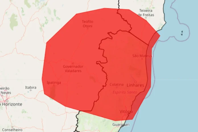 O aviso cobre regiões do Vale do Rio Doce, centro e noroeste do Espírito Santo, Jequitinhonha, litoral norte do Espírito Santo, Vale do Mucuri, sul da Bahia, zona da mata, região metropolitana de Belo Horizonte e sul do Espírito Santo.