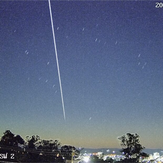 O brilho apareceu porque a luz do sol ainda iluminava o caminho dos satélites recém lançados. O foguete Falcon 9 partiu da Base da Força Espacial de Vandenberg, na Califórnia, levando mais satélites para oferecer internet rápida em áreas distantes.