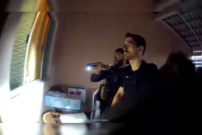 Ao entrarem na residência, os policiais ordenaram: Levanta a mão!.