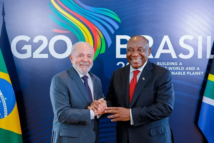 O presidente Luiz Inácio Lula da Silva (PT) conversou na manhã desta segunda-feira (17/11) com o presidente da África do Sul, Cyril Ramaphosa, por telefone. O contato ocorreu pouco antes da viagem do presidente brasileiro a Johanesburgo para participar da Cúpula de Líderes do G20, marcada para os dias 22 e 23 de novembro. Atualmente, a presidência do G20 está sob responsabilidade da África do Sul.