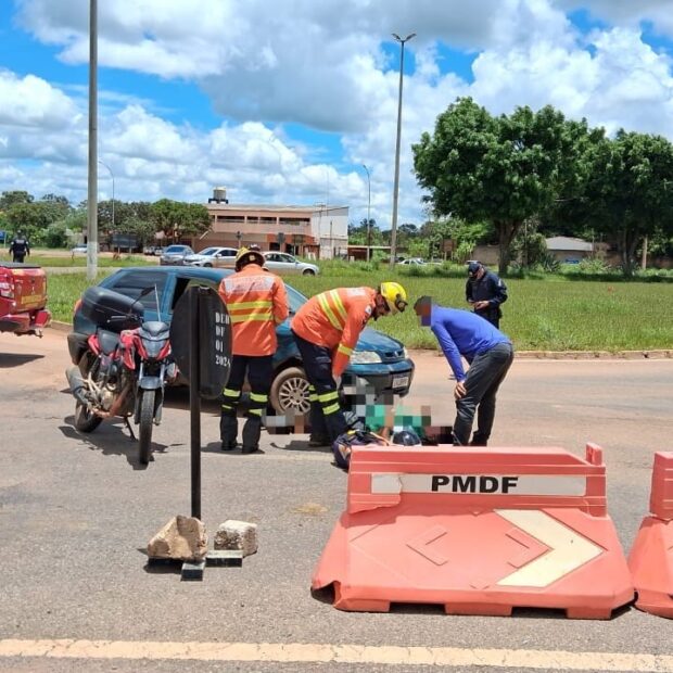 As equipes encontraram uma colisão entre uma motocicleta Honda CG 160 Fan vermelha e um carro Fiat Palio azul. O motociclista estava consciente e orientado, foi atendido seguindo os procedimentos de trauma e levado para o hospital para avaliação médica.