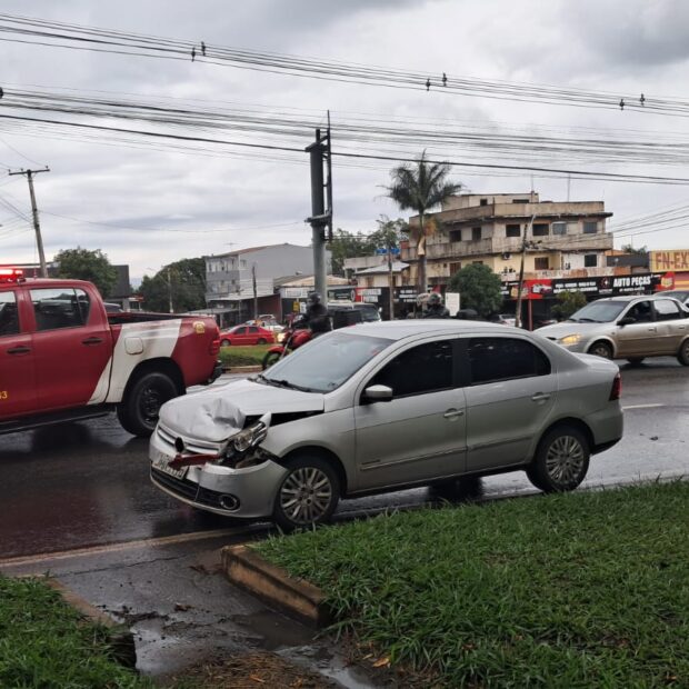 No acidente, uma motocicleta Harley-Davidson preta colidiu com um carro VW Voyage cinza. O piloto da moto estava consciente e orientado, apresentando um ferimento na mão esquerda.