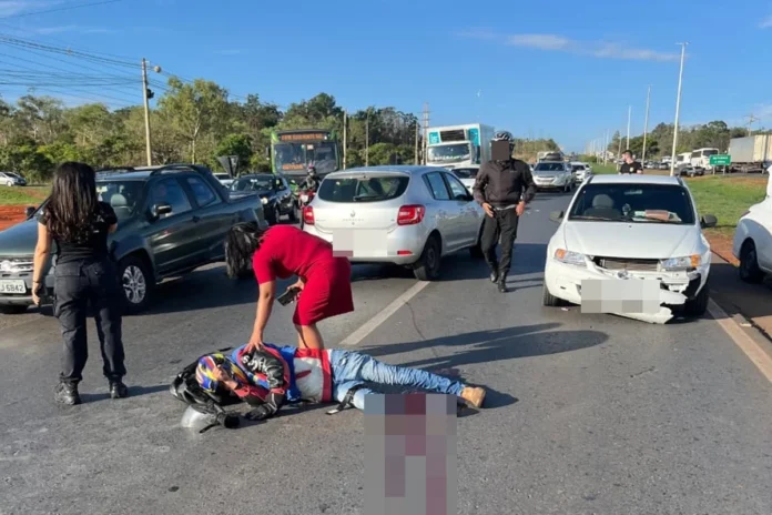 Um motociclista sofreu uma fratura grave na perna depois de colidir com um carro na manhã desta segunda-feira (10/11), na BR-020, em direção a Planaltina.