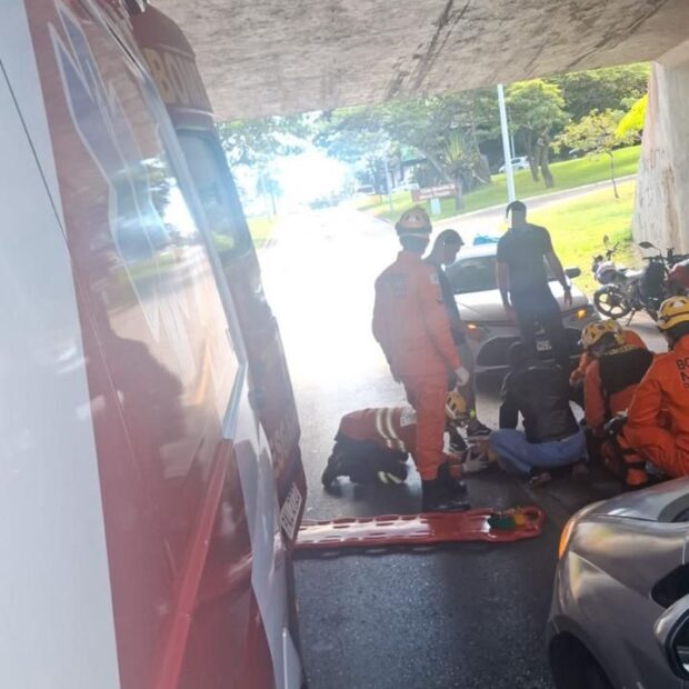 O Corpo de Bombeiros Militar do Distrito Federal (CBMDF) foi acionado às 11h45 e enviou duas viaturas ao local. Ao chegar, encontraram a condutora da motocicleta caída no chão.