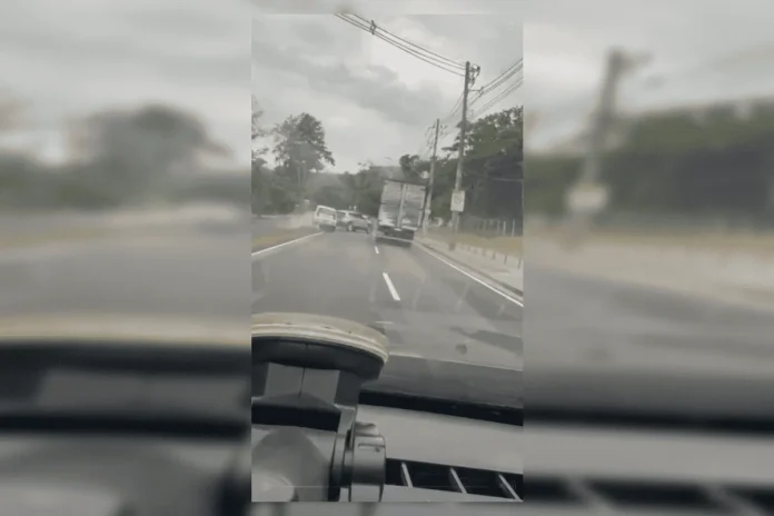 Um motorista de caminhão desviou seu veículo de forma brusca e atingiu um carro branco em Guaratiba (RJ) na Estrada do Mato Alto, nesta segunda-feira (24/11). O vídeo registrado mostra o momento em que o carro branco tenta passar o caminhão, mas o caminhoneiro reage jogando o caminhão contra ele, provocando o lançamento do automóvel para outra pista.