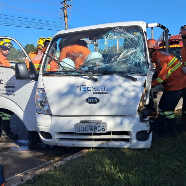 Um motorista ficou preso dentro do caminhão depois que o veículo colidiu contra um poste na manhã desta quinta-feira (30), na DF-010, perto do acesso ao Setor Militar Urbano (SMU), próximo ao Quartel General do Exército.