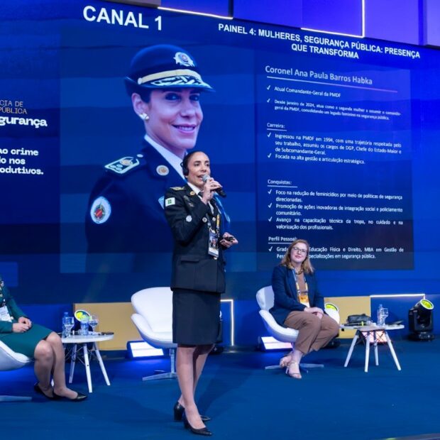 A II Conferência de Segurança Pública iLab Segurança, iniciada no dia 3 de março, discutiu a importância das mulheres na Polícia Militar do Distrito Federal (PMDF). A comandante-geral, Coronel Ana Paula Habka, conduziu o painel intitulado ‘Mulheres, Segurança Pública: presença que transforma’, ressaltando o protagonismo das mulheres nas forças de segurança e a importância do trabalho coletivo para proteger a sociedade.
