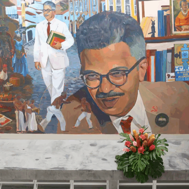 No mural, Edison Carneiro aparece vestido com um terno branco, caminhando alegremente por Salvador, sua cidade natal, segurando seus livros. Ele é chamado de “intelectual feiticeiro” pelo escritor Jorge Amado, seu amigo e companheiro de militância no Partido Comunista – uma referência que também está presente no mural. Edison Carneiro também é representado como Exu, um orixá simbólico que liga diferentes mundos. Ao redor dele, há referências à cultura popular, como um boizinho de barro, capoeiristas e um livro sobre samba, que ele pesquisou e ajudou a divulgar.