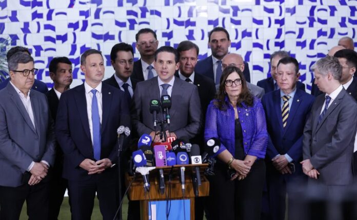 Hugo Motta, presidente da Câmara dos Deputados, e o relator do projeto do marco legal de combate ao crime organizado, deputado Guilherme Derrite, propuseram um texto buscando endurecer as penas, valorizar as forças de segurança e integrar diferentes níveis do governo no enfrentamento ao crime organizado.